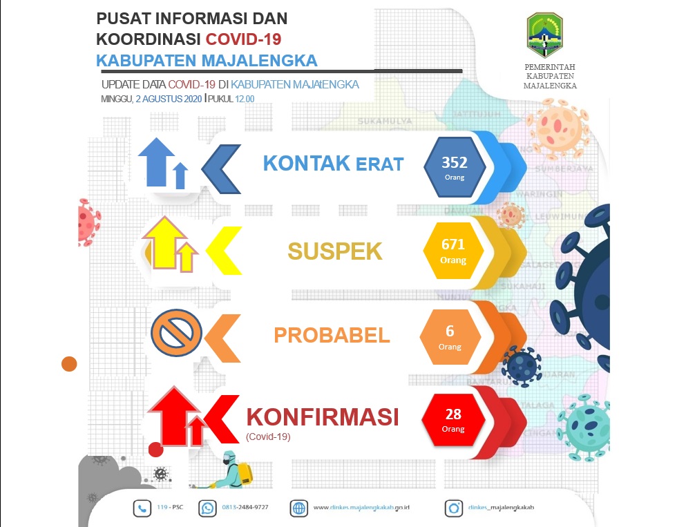 Menurut dia, hari ini dari laporan yang diterimanya ada kenaikan kasus positif Corona di Majalengka sebanyak 3 orang. "Kalau terkonfirmasi positif ada 28 orang. Probabel 6 orang, Suspek 671 orang dan kontak erat 352 orang.