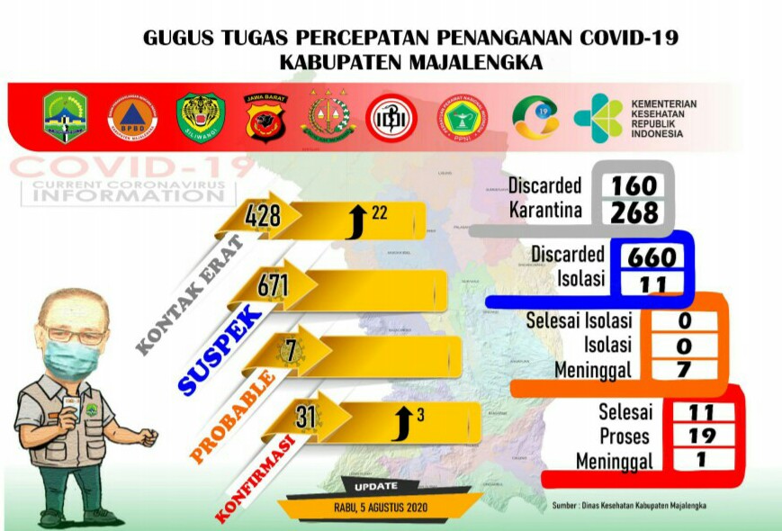 MAJALENGKA- Kasus terkonfirmasi positif Covid-19 di Kabupaten Majalengka, Rabu (5/8/2020) kembali bertambah sebanyak 3 orang. Mereka terpapar berasal dari 2 orang dari Desa Bantarwaru Kecamatan Ligung dan 1 orang dari Desa Leuwikujang Kecamatan Leuwimunding.