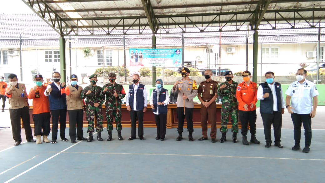 Pada kesempatan tersebut pula, Bupati secara simbolis menerima bantuan berupa masker berjumlah 32.000 dari Provinsi Jawa Barat.