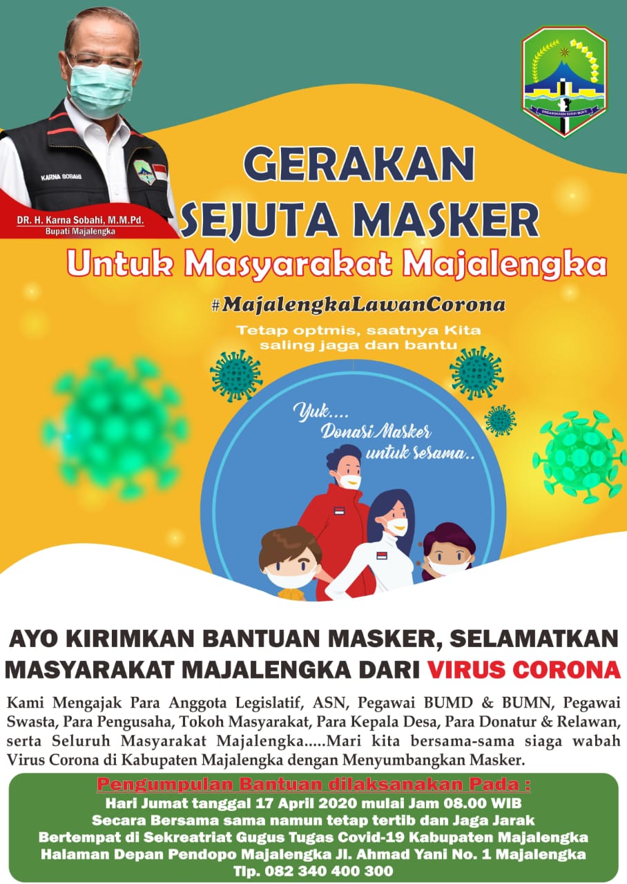 Bupati Majalengka Dr. H. Karna Sobahi, M.MPd menuturkan, gerakan sosial ini difokuskan pada pengadaan sejuta masker yang akan dibagikan secara gratis kepada seluruh masyarakat, dalam mencegah penyebaran virus corona.